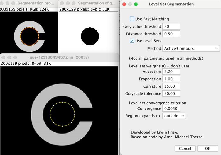 で、回答者が「Oval ROIを使って手で測れ」といっている。まあそうなのだが、質問者の意図はもっと自動的に(つまり客観的に)やりたいということなので、あまりよい回答ではないなあ、と思った(私自身はYahooに回答したことがないので僭越ではあるのだが)。FijiにはPlugins>Segmentation>LevelSetという昔からあるプラグインが同梱されていて、この機能の一部が動的輪郭法である。これは、仮想上の輪ゴムを伸ばしたり縮めたりしながら形にフィットさせる、という手法で、輪ゴムの張力を上げ下げすることでどのような輪郭を分節化したいか、調整することができる。ふにゃふにゃな形にピッタリフィットするようにするには張力を上げればよいし、ふにゃふにゃなかたちにフィットしないでもなめらかな輪郭を得たいならば輪ゴムの張力を上げる。単純にはこのようなことで、実際にはなにをもって形とするかパラメータ設定がややこしくなったりする(はっきりした形ならラクだが、境界が曖昧だと工夫するひつようがある)。