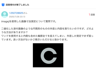 あと実はハフ変換という手法もあって、これでも円の検出が一瞬でできるので、たぶん内径と外径を同時にはかることができるだろう。これは、プラグインを入れないといけないので、面倒なので試していない。
