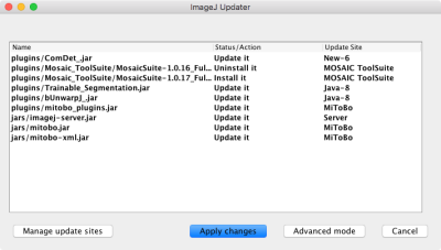 If nothing is listed, just close the window because your Fiji is at the latest status. If you see the list like the image shown above, then click “Apply Changes” button. Fiji will start downloading newer files, and then when completed, it will ask you to restart Fiji - so please restart.